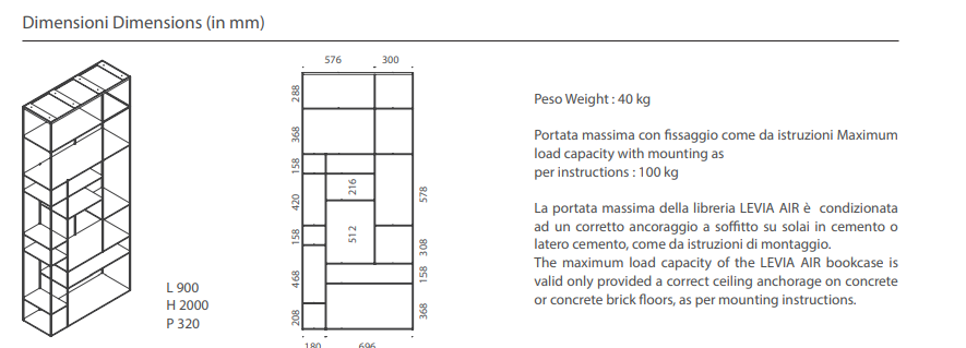 La bibliothèque Levia Air est conçue pour un montage suspendu. Charge maximale avec fixation selon instructions 100 kg. La bibliothèque Levia Air doit être correctement ancrée uniquement sur des sols en béton ou en maçonnerie, en suivant les instructions.